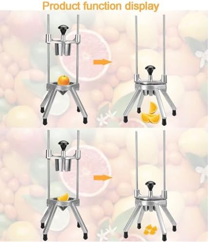 The lemon cutter is expertly crafted from high-quality aluminum alloy, featuring a durable die-cast design that resists oxidation. Equipped with food-grade stainless steel blades, this cutter ensures safe and healthy use. Using this multifunctional lemon cutter is simple: place your chosen fruits and vegetables on the blade assembly and pull down the pusher block to create perfectly uniform slices in either 6 or 8 wedges. The stainless steel blade reduces squeezing and bruising, enabling you to make ideal wedges quickly and efficiently. Designed with a compact square cutting area, it effectively accommodates medium-sized produce while maintaining blade durability. Please note that it is not suitable for hard vegetables such as sweet potatoes. The heavy-duty aluminum alloy construction provides exceptional stability, enhanced by four durable non-slip feet that absorb shocks for optimal performance. For your convenience, all parts are easily disassembled for quick cleaning. This versatile wedges cutter is a valuable addition to both home kitchens and professional restaurants, allowing effortless dicing of various ingredients such as apples, citrus fruits, cucumbers, onions, tomatoes, celery, green bell peppers, and mushrooms.